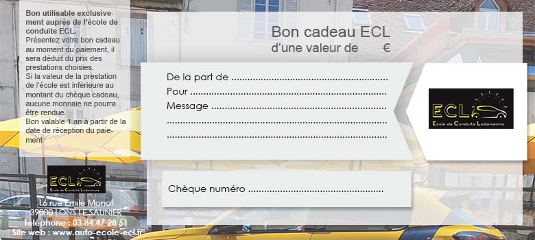Votre auto-école de Lons-le-Saunier (39, Jura) vous propose ses chèques cadeaux, valable sur le code et le permis.